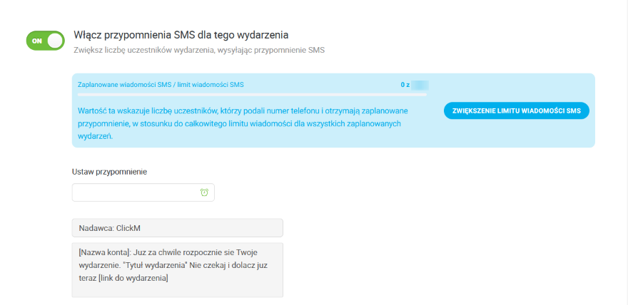 - w zakładce Automatyzacja w tworzonym wydarzeniu włącz funkcję Przypomnienia SMS oraz ustaw czas wysyłki