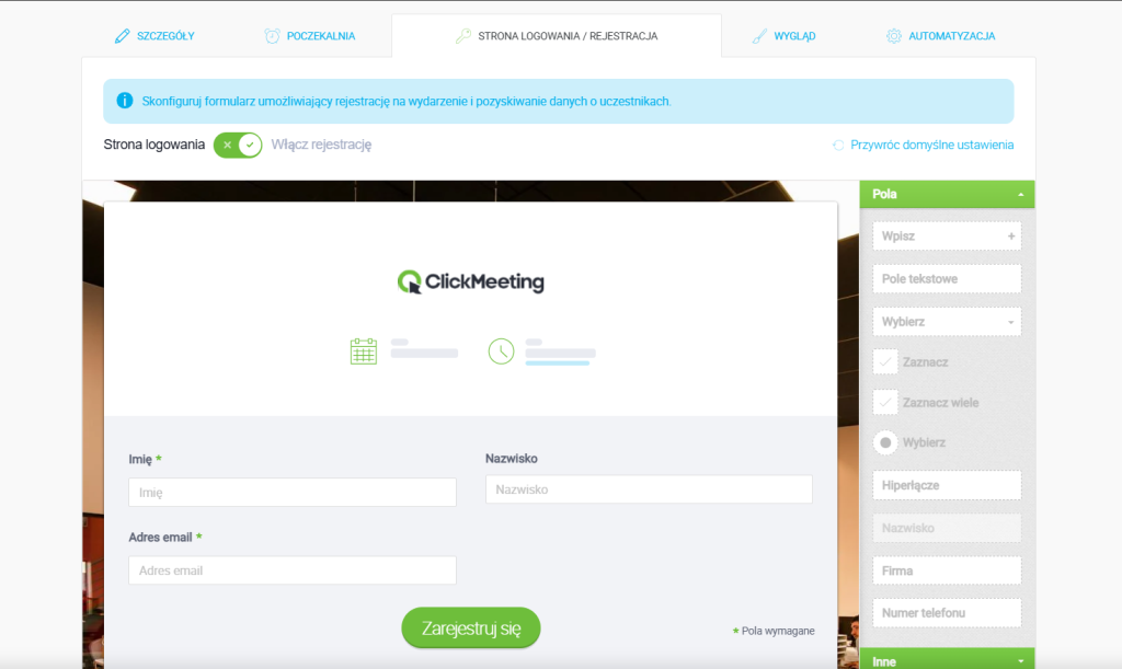 Rejestracja jest dostępna i należy ją włączyć dla wybranego wydarzenia. Przejdź do zakładki Rejestracja, ustaw przycisk rejestracji do pozycji On i wybierz interesujące Cię pola (imię, adres e-mail itd.). Za pomocą akcji przeciągnij i upuść wstaw dodatkowe pola z prawego panelu bocznego i nadaj im własną nazwę.