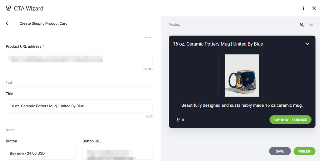 С помощью кнопки Призыв к действию можно настроить перенаправление на продукт в магазине Shopify. Достаточно добавить ссылку на продукт, и система автоматически загрузит данные о продукте (название, описание, цена, фотография, URL) в баннер Призыв к действию в чате.