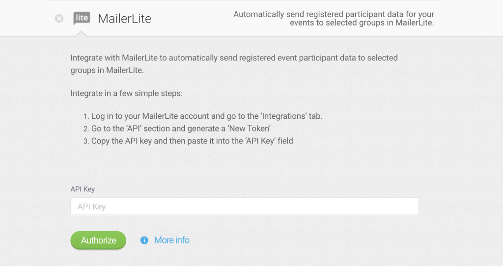 Select the Integrations tab. Choose MailerLite from the list of available integrations, paste the copied API key, and click Authorize.