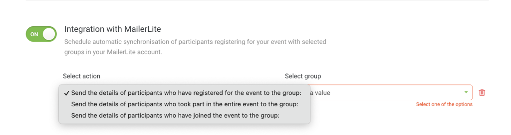 - Send the data of participants who joined the event to group X – selected from MailerLite.